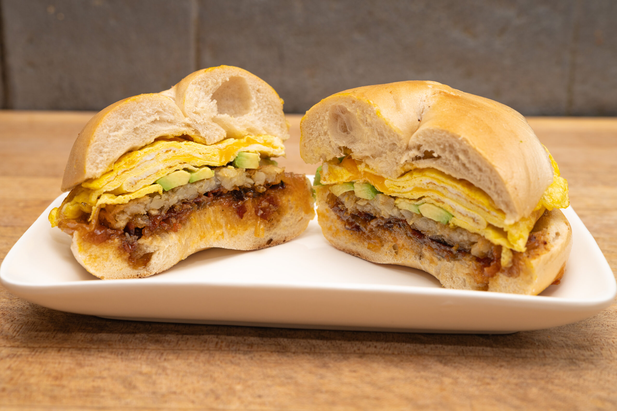 Our new sandwich! 2 Eggs, Cheddar Cheese, Our Homemade Bacon Jam, Hash Brown and Avocado!