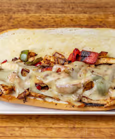Hero with Marinated Grilled Chicken Breast, Sautéed Peppers and Onions and Swiss cheese.