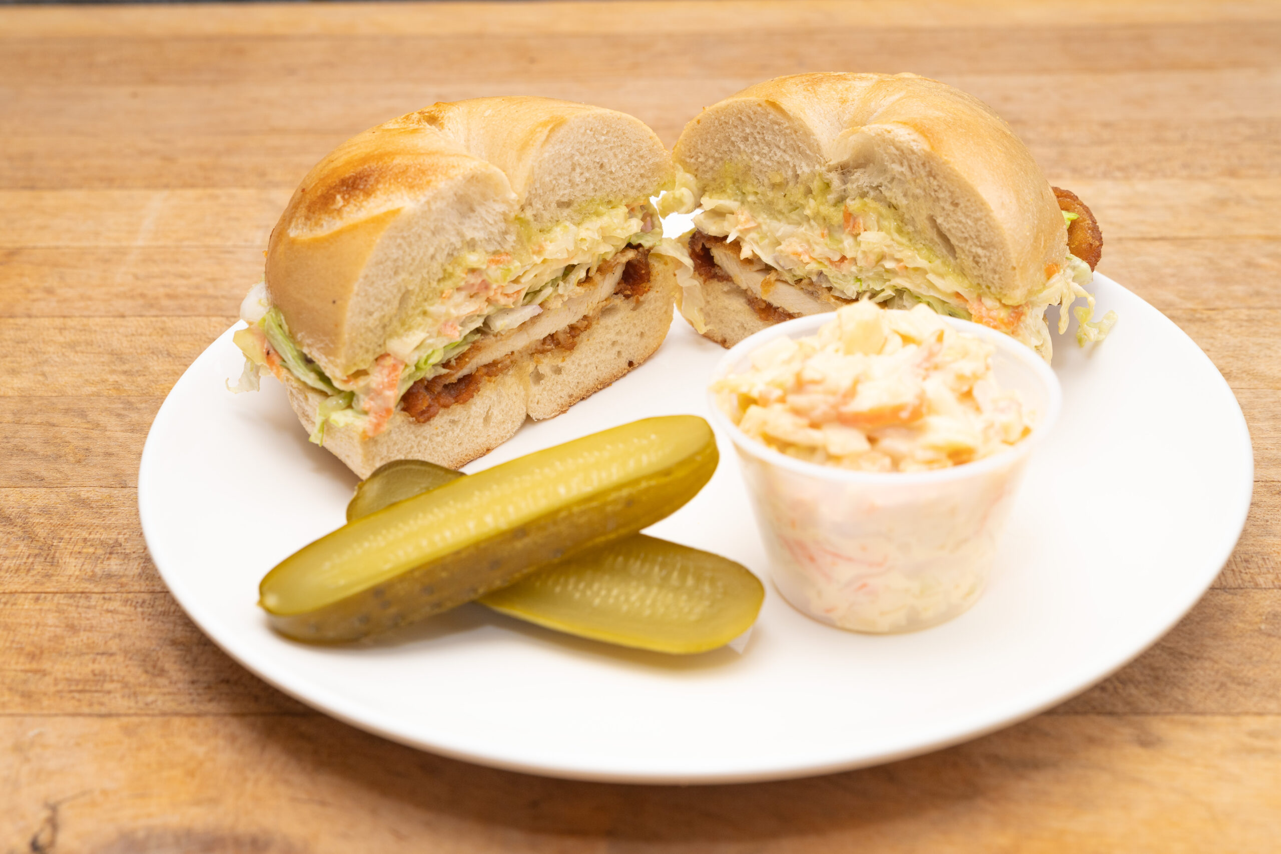 New Sandwich Special! Fried Chicken Breast, Our New Homemade Cilantro Jalapeño Aioli, Coleslaw, Onion, on a Bagel! Comes with a Pickle and 1/4lb salad choice of one: Macaroni, Potato or Coleslaw!