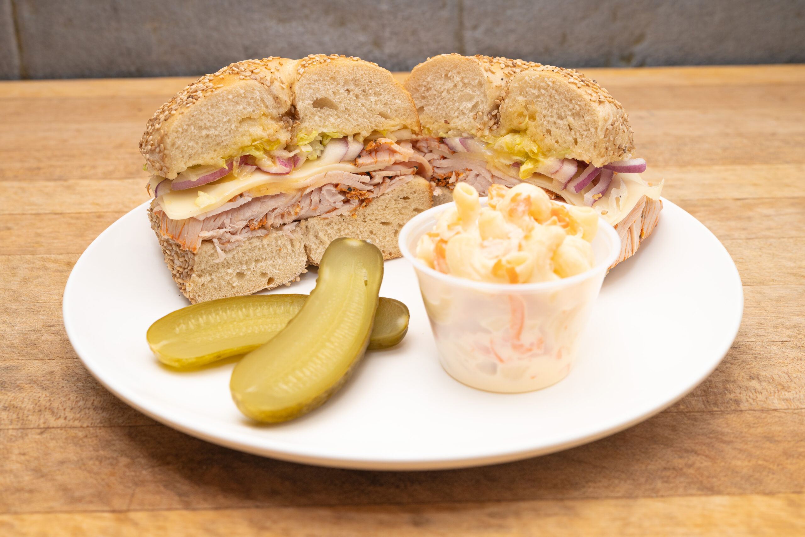 Boar’s Head Cracked Peppermill Smoked Turkey, Swiss, Lettuce, Onion and Golden Italian Dressing. Comes with a Pickle and 1/4lb. salad choice of one: Macaroni, Potato or Coleslaw!