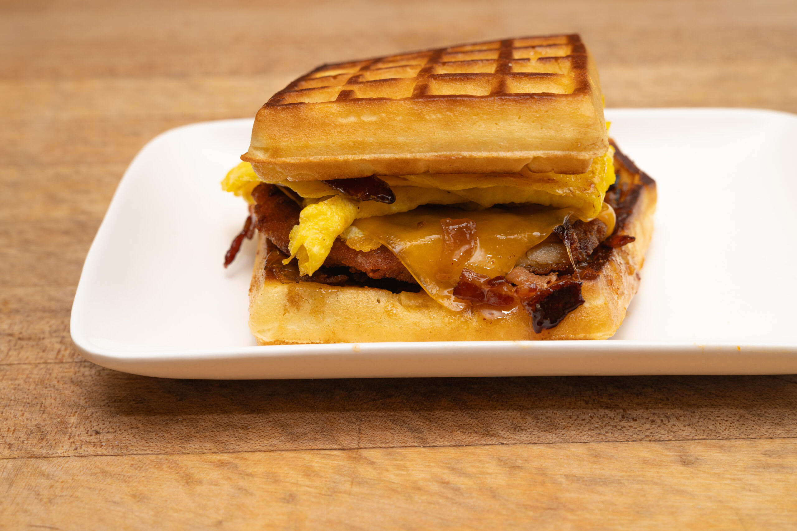 The Waffle Cluckin’ Sandwich! A Waffle Sandwich (a piece of waffle on both ends as the “bread”) with Fried Chicken Breast, Hot Honey, Bacon Jam, 2 Eggs and Cheddar Cheese!